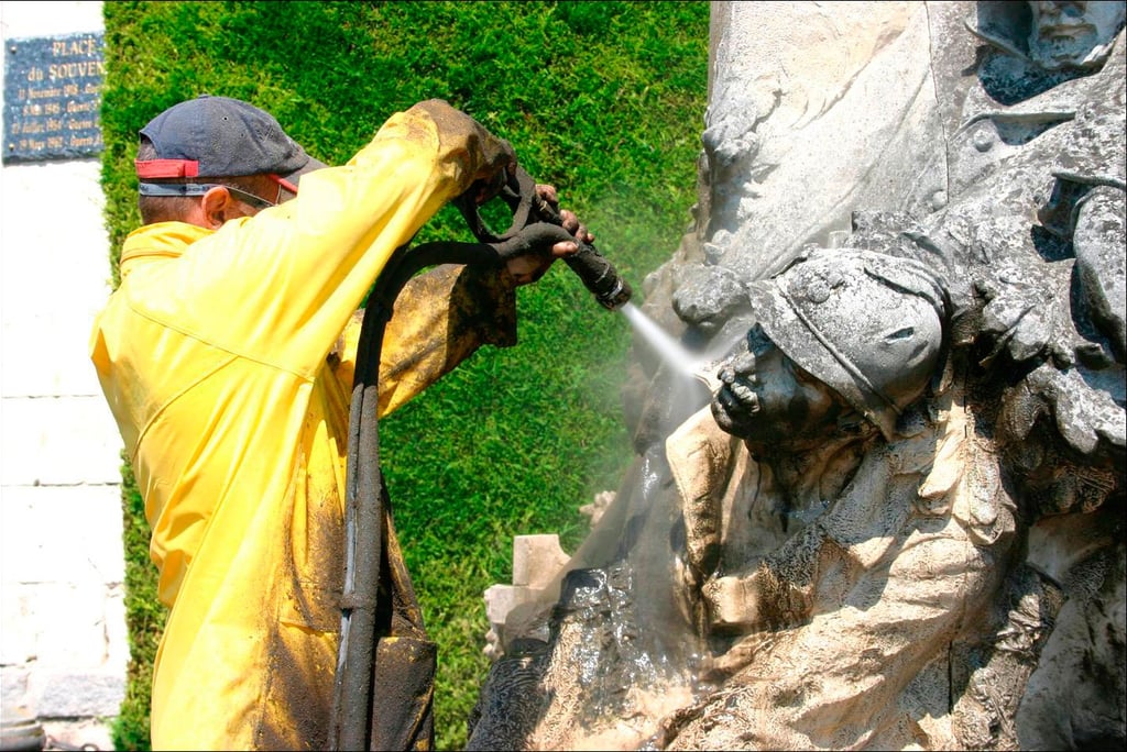 Monuments publics ou funéraires, mobilier urbain, etc., le nettoyage des monuments est un domaine ou l'hydrogommage excelle. Le travail en basse pression allié à des granulats tendres permet la rénovation de ces surfaces fragiles sans détérioration.